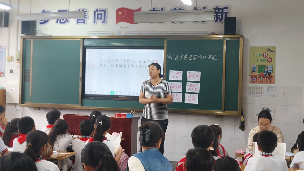 活动伊始,全体语文教师在三(2)班观摩了王冰云老师讲授的《铺满金色巴掌的水泥道》一课。王老师以诗意教学为主线,通过范读引路、带领学生走进文本,直观感受秋日水泥道的唯美意境;针对“熨帖”“凌乱”等易混淆词语,她巧妙结合学生生活经验、课文插图等将抽象词汇转化为具象认知,有效突破教学难点。整节课环节层层递进,充分调动了学生的学习热情,展现出青年教师扎实的教学功底与创新的教学设计思路。