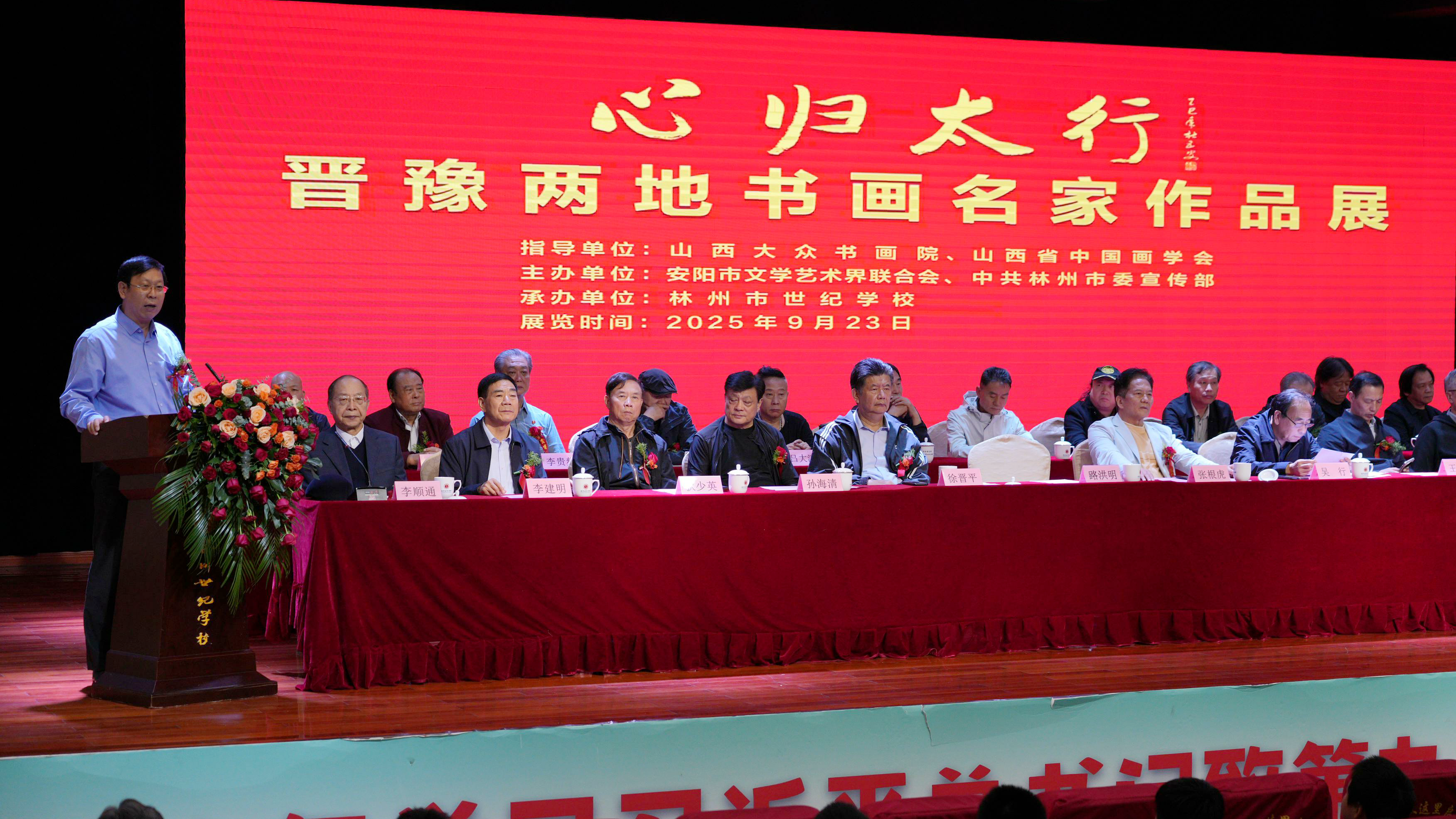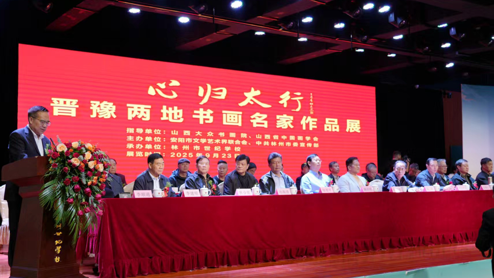 映象网讯(大象新闻记者 孙喜增 )9月23日上午,“心归太行——晋豫两地书画名家作品展”在安阳林州世纪学校拉开帷幕。晋豫两地40余名书画名家齐聚一堂,以笔为媒、以墨为语,用120余幅精品力作勾勒太行风骨、传递红旗渠精神,为现场观众带来一场兼具艺术美感与精神力量的文化盛宴。