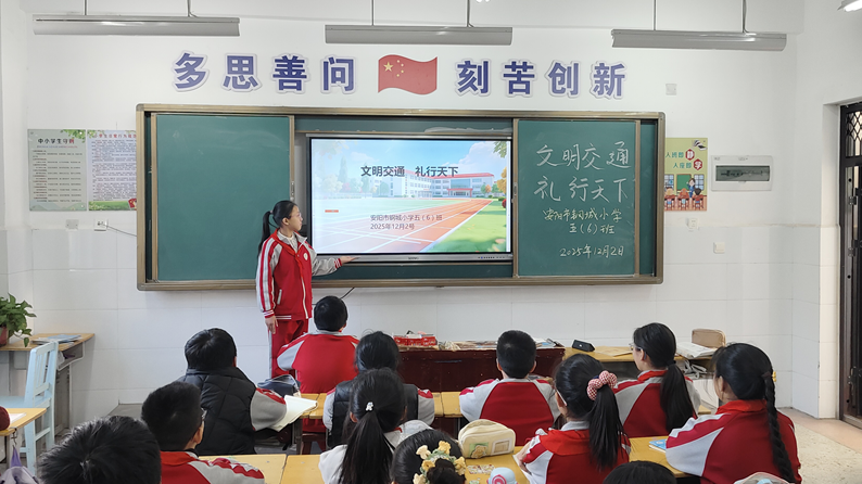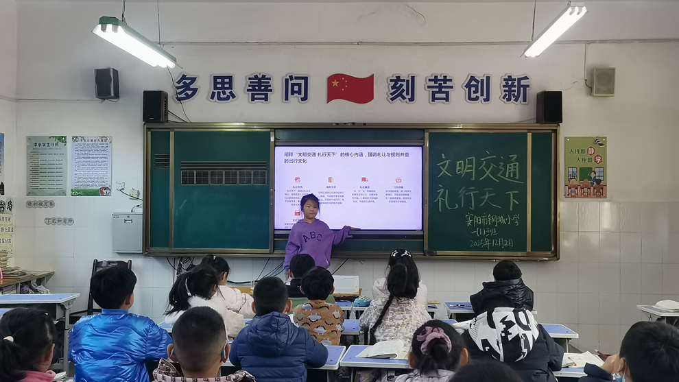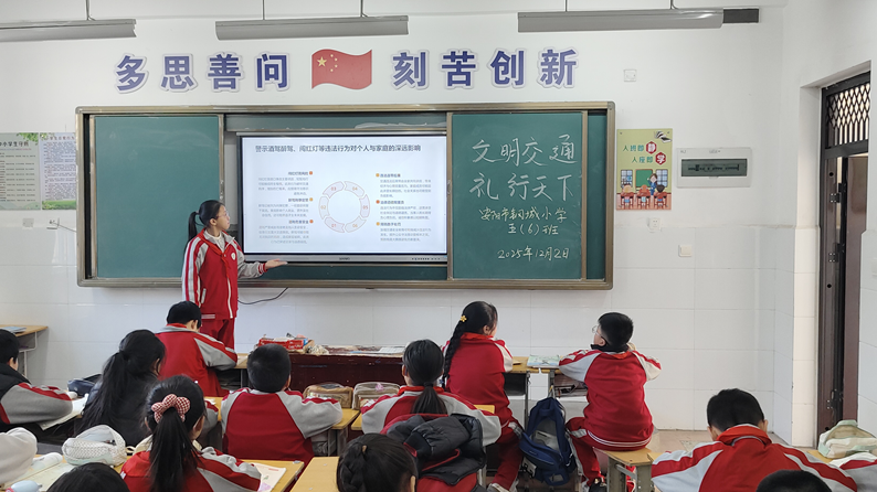 活动中,学校通过国旗下讲话筑牢思想防线:三年级学生代表结合生活实例发出安全倡议,呼吁同学们以行动践行交通准则;学校领导借升国旗契机讲授交通安全课,提醒师生严守法律法规,防范事故风险。各班级召开主题班会,通过讲解步行、乘车、骑车等交通规则,展示识别交通标志,分析典型事故案例等形式,让学生深刻认识违反交通规则的危害。同时,学校电子屏滚动播放交通安全主题内容,通过班级微信向家长转发安全知识,构建“校园+家庭”联动教育网络,广泛宣传“一盔一带”的重要性,引导师生家长主动规范出行行为。