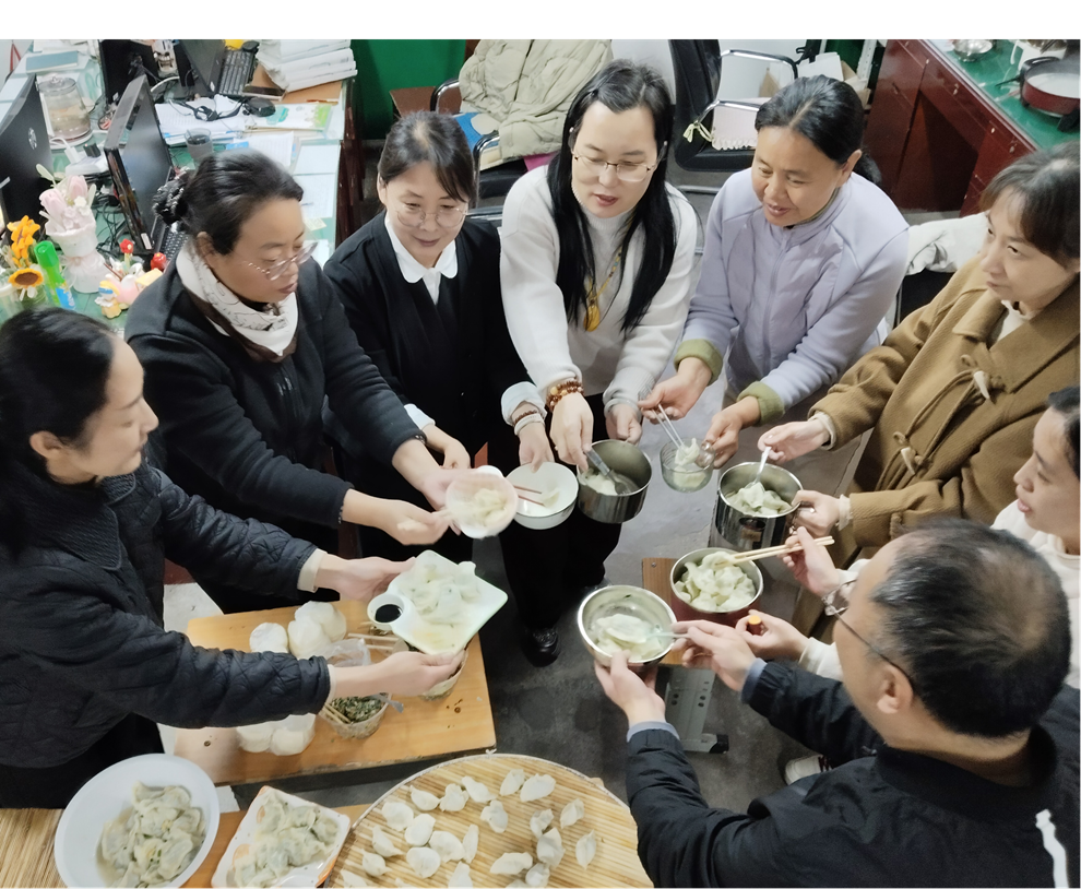 本次活动以工会小组为单位进行。各组教师们积极响应,热情高涨,他们团结一致、分工协作,有的擀皮,有的包饺子,有的煮饺子,还有的品尝饺子的美味。在融洽、欢快的氛围中,各组老师们一边包饺子一边交流擀皮、包饺子、煮饺子的方法和技巧。还有的组开展了包饺子比赛,看谁擀皮擀得圆,看谁包得快,看谁包的饺子更好看,各组纷纷在学校微信公众号晒出本组的靓照。在其乐融融的活动中,各位老师打开了话匣子,谈论在家过冬至和在学校过冬至的感受,交流包饺子技艺,共话冬至习俗,回忆以往冬至包饺子的趣事。共同的目标,欢快的氛围,轻松的话题,使各个办公室充满了欢快的笑声,教师们在品尝美食的同时,身心也得到了放松。此次活动,丰富了教师的生活,增进了教师间的交流,提高了学校的凝聚力,让教师们提前度过了一个别样温馨的冬至。