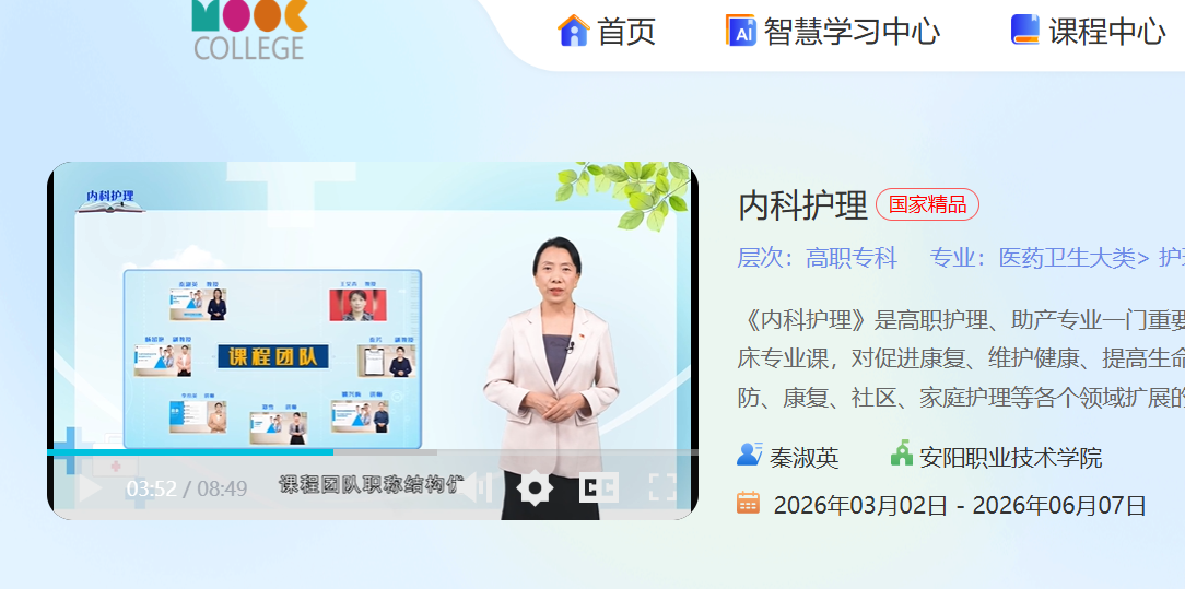 2024年10月,该校《内科护理》课程顺利通过教育部遴选,成功入选职业教育国家在线精品课程,课程建设水平获得国家级权威认可,为护理专业线上线下混合式教学与优质资源共享奠定坚实基础。