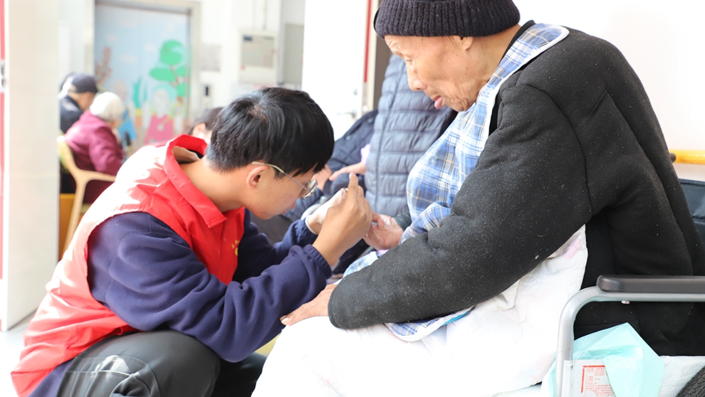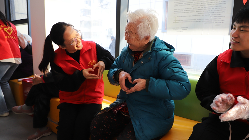 除了生活服务,志愿者们还准备了精彩的文化互动。最甜蜜温馨的是分享节日蛋糕的环节,当志愿者们推出点缀着寿桃与“健康长寿”字样的节日蛋糕,九根蜡烛静静燃着温暖的火苗,象征着“健康长长久久”的美好祝愿。在大家齐声唱响的生日祝福中,几位老人笑盈盈地一起吹灭蜡烛。随后,志愿者们细心地将蛋糕分好,一一送到老人手中,每一口香甜,都化作心头的暖流。